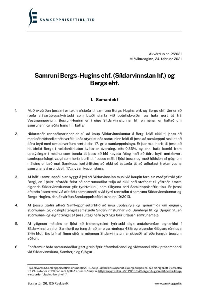Í máli þessu er hins vegar ekki tekin endanleg afstaða til mögulegra yfirráða samkvæmt framangreindu. Kemur þar tvennt til: Í fyrsta lagi leiðir rannsókn á kaupum Síldarvinnslunnar og Bergs í ljós að ekki eru forsendur til íhlutunar í samrunann, miðað við fyrirliggjandi upplýsingar, þótt komist væri að niðurstöðu um hin mögulegu víðtækari yfirráð. Í öðru lagi myndi endanleg úrlausn framangreindra yfirráða kalla á víðtækari gagnaöflun og rannsókn sem taka myndi til fleiri aðila. Ekki eru tök á því í þessu samrunamáli.