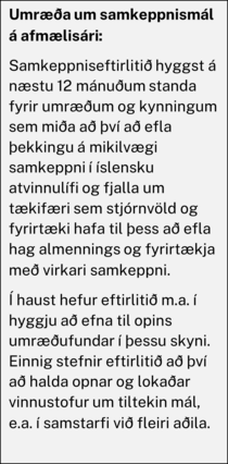 „Það eru í senn krefjandi og spennandi tímar framundan í atvinnulífi hér á landi sem erlendis. Reynslan sýnir okkur að þeim þjóðum vegnar best sem skapa atvinnulífi sínu sterkan grundvöll þar sem virk samkeppni er sett á oddinn. Við þær aðstæður keppast fyrirtæki við að bjóða sem bestar vörur og þjónustu á sem hagstæðustu verði, á grundvelli nýsköpunar og áræðni. Áherslur Samkeppniseftirlitsins fram á veginn taka eðli máls samkvæmt mið af þessu“.